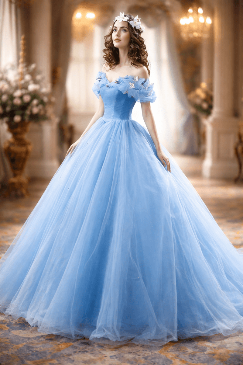 A graceful sky-blue princess ball gown featuring an off-shoulder neckline, lace appliqué bodice and a full flowing tulle skirt that creates a classic fairytale silhouette.