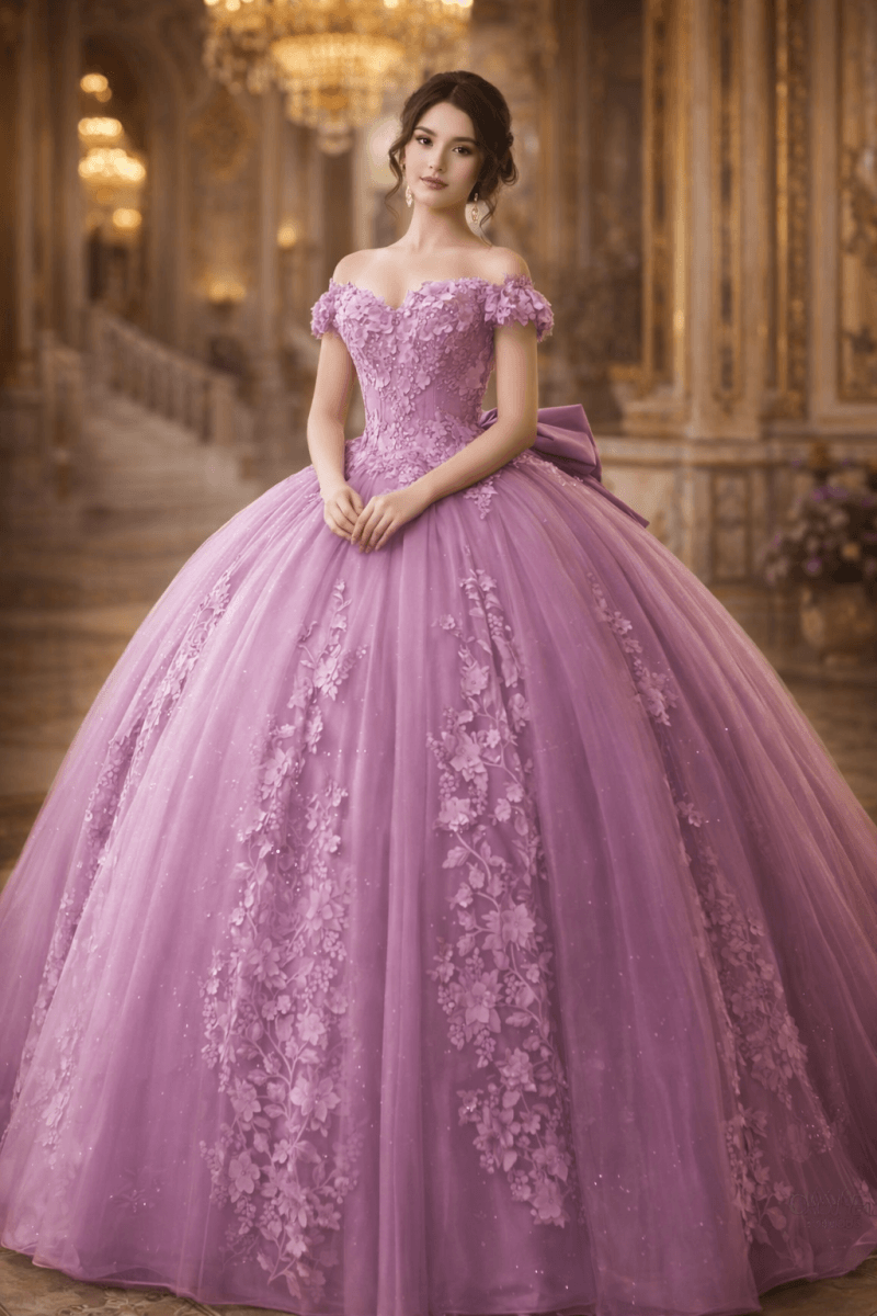 A luxurious off-shoulder ball gown featuring delicate floral appliqués, layered tulle and a dramatic bow detail at the back.