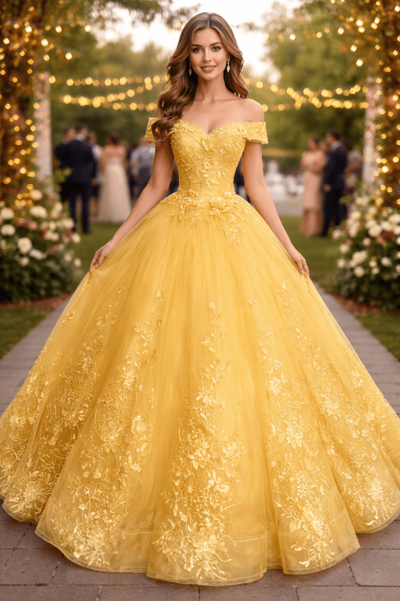 5. Gold Lace Appliqué Off-Shoulder Ball Gown