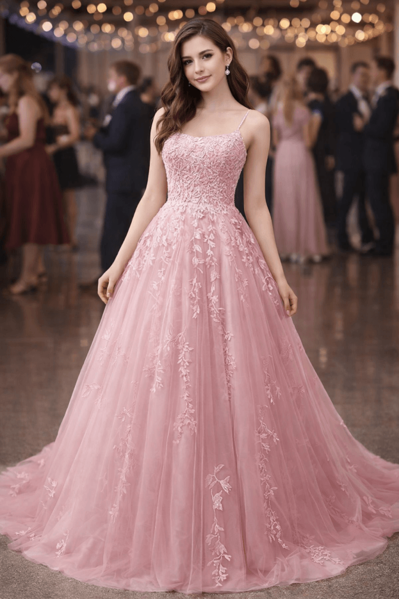 A romantic blush pink ball gown designed with soft layers of tulle, delicate lace appliqués and slender spaghetti straps. The scoop neckline and flowing A-line silhouette create a graceful princess look.