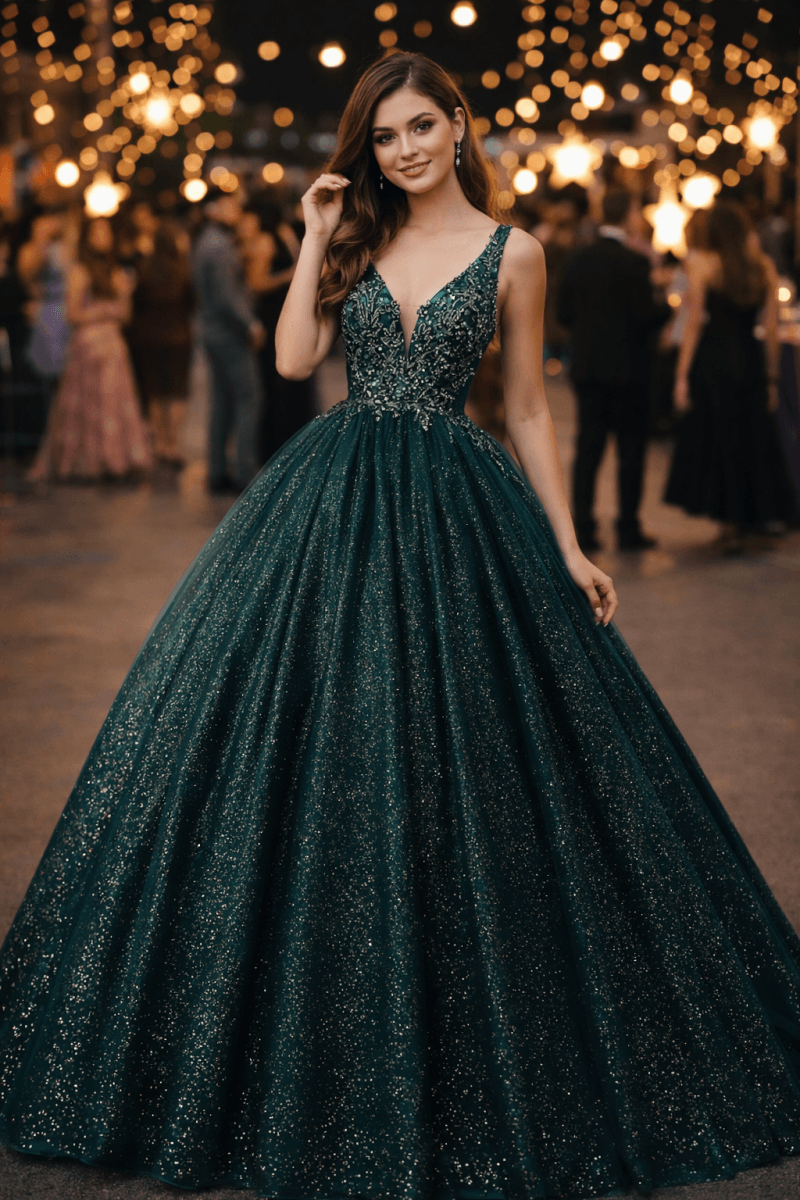 This gown feels regal because of its rich gold tone and detailed lace craftsmanship. The lace appliqués create a textured bodice that catches attention without looking excessive. The V-neck design balances the dramatic skirt while the fitted waist creates a flattering silhouette. The craftsmanship and materials give the gown a refined red-carpet presence.