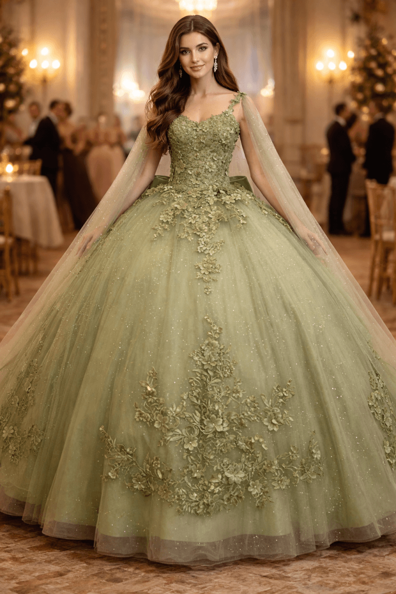 The cape detail gives this gown a unique royal presence that immediately stands out. The beaded lace bodice adds texture and elegance while the full skirt creates dramatic volume. The lace-up back allows the fit to be adjusted comfortably, helping the dress maintain its shape beautifully.