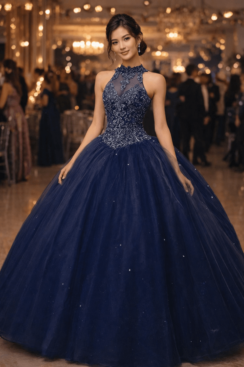 4. Navy Blue Sparkly Tiered Corset Ball Gown