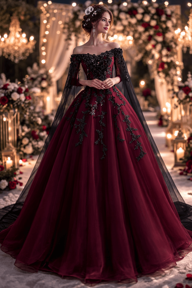A dramatic off-shoulder ball gown featuring intricate lace appliqués, dimensional 3D floral details and a flowing cape that creates a bold statement silhouette.
