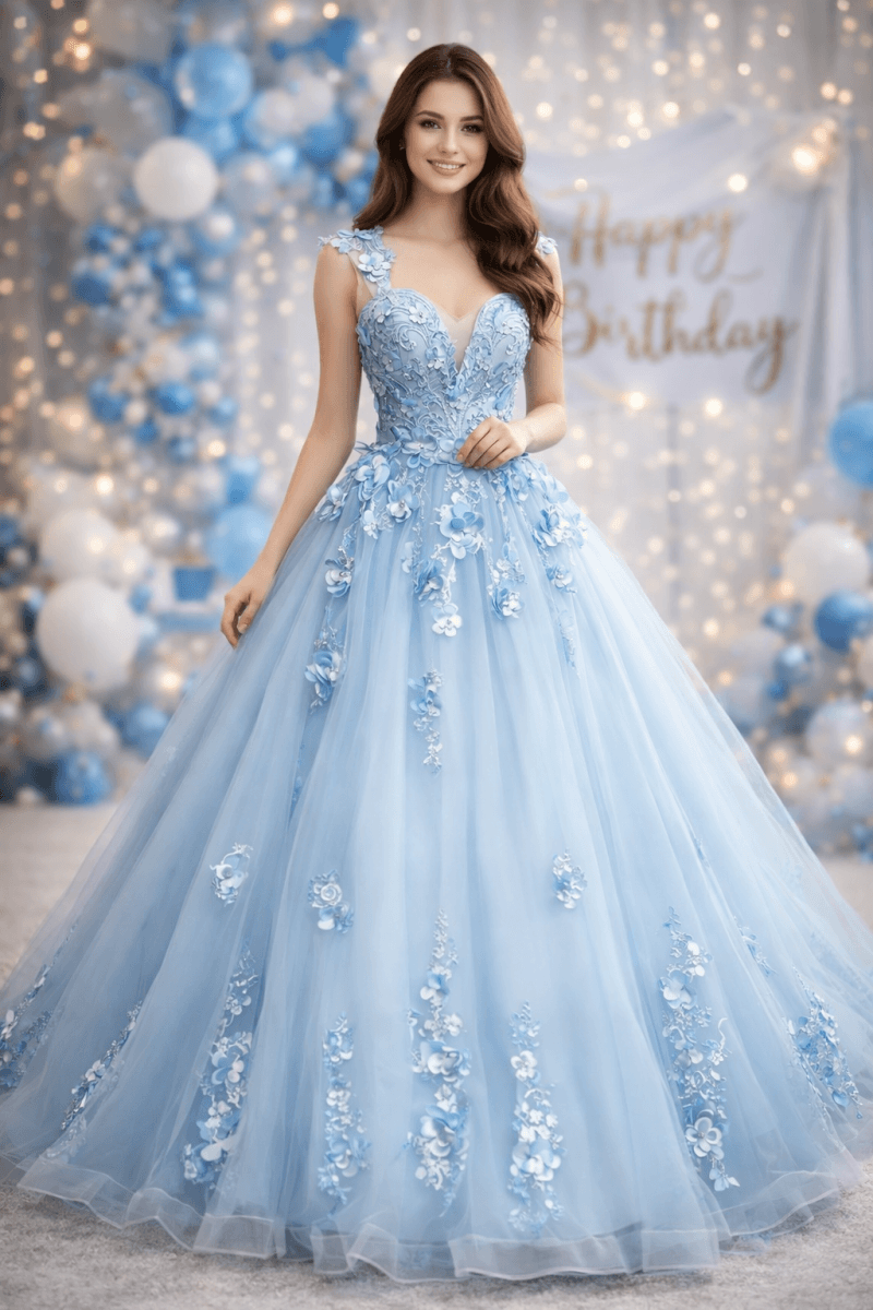 What makes this gown beautiful is the elegant off-shoulder neckline combined with the dramatic fullness of the skirt. The lace appliqué detailing adds depth and texture while the flowing tulle layers create movement when walking or dancing. The lace-up back provides adjustable support that helps the dress maintain its shape. The soft blue color also gives the gown a refined and dreamy appearance that works beautifully for formal celebrations.